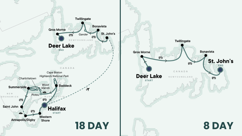 Flights to/from the start/end cities (except the Halifax → St John’s internal flight on the 18-day), optional activities, meals/snacks not listed, personal drinks (alcohol is BYO), personal gear, laundry, souvenirs, and tips (at your discretion).