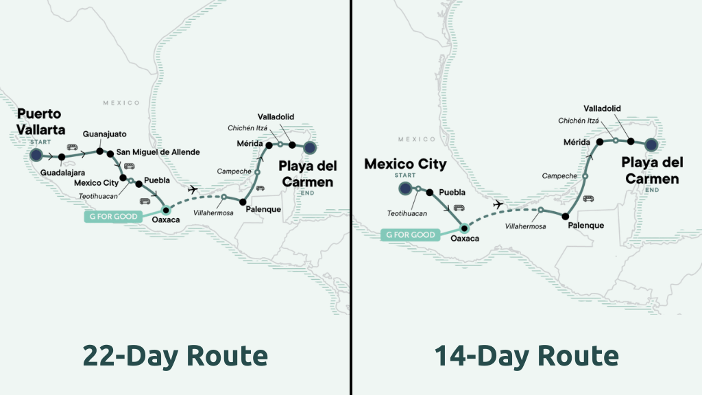 The 14-day runs Mexico City → Playa del Carmen. The 22-day adds a Pacific coast segment (Puerto Vallarta → Guadalajara → Bajío) before joining the same route in Mexico City.