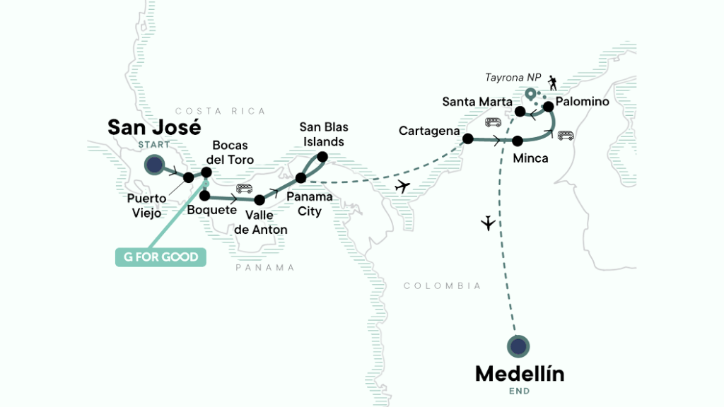 A mix of public buses, private vehicles, boats/water taxis, walking, and two regional flights (Panama→Cartagena; Santa Marta→Medellín). Follow CEO guidance for baggage weight on regional flights.