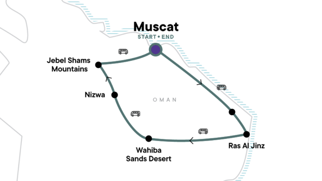 - Duration & route: 8 days round-trip Muscat → coast & wadis → Sharqiya (Wahiba) Sands → interior → Muscat.