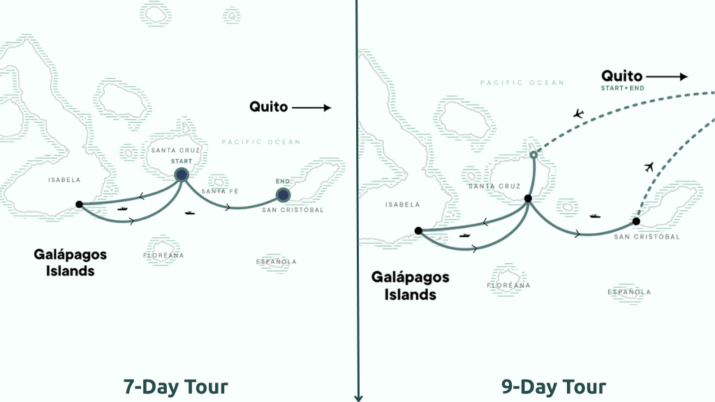 • Start/Finish: 7-day: Santa Cruz → San Cristóbal · 9-day: Quito ↔ Galápagos