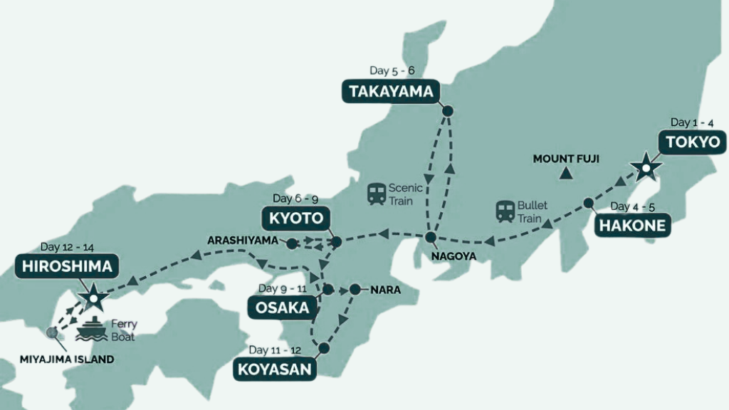One core route; 10 days covers the hits, 14 days deepens the culture and history (Koyasan, Nara, Hiroshima, Miyajima).