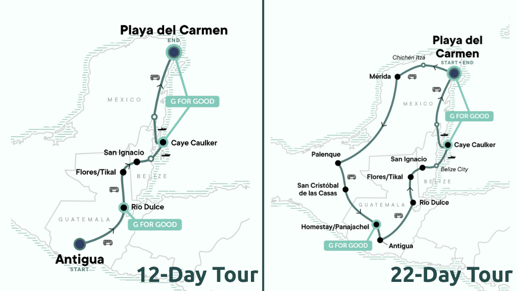 Boat ride on the Río Dulce to Livingston with a community lunch; guided Tikal visit; Bike with Purpose community ride on Caye Caulker; and a community dinner at El Hongo in Playa del Carmen.