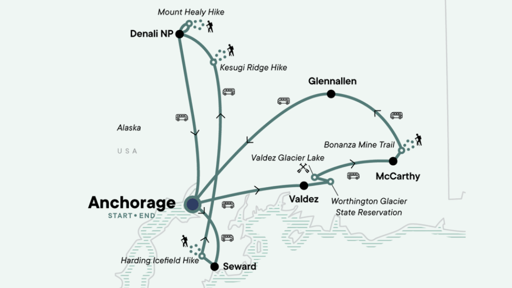• Road distance (tour total): ~2,000 km (Anchorage ⇄ Seward, Talkeetna/Denali, Valdez, McCarthy/Glennallen legs).